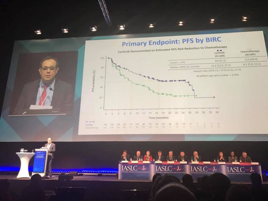 Apresentado pelo Dr. Gilberto de Castro Junior, chefe da área de Oncologia Torácica e Câncer de Cabeça e Pescoço do Instituto do Câncer do Estado de São Paulo (Icesp), o estudo ASCEND-4 mostrou a superioridade do ceritinibe quando comparado à quimioterapia como tratamento de primeira linha para câncer de pulmão não-pequenas células (CPNPC) metastático com translocação da cinase do linfoma anaplásico (ALK+). Os resultados do estudo foram divulgados esta semana na 17ª Conferência Mundial de Câncer de Pulmão da International Association for the Study of Lung Cancer (IASLC), em Viena, na Áustria.