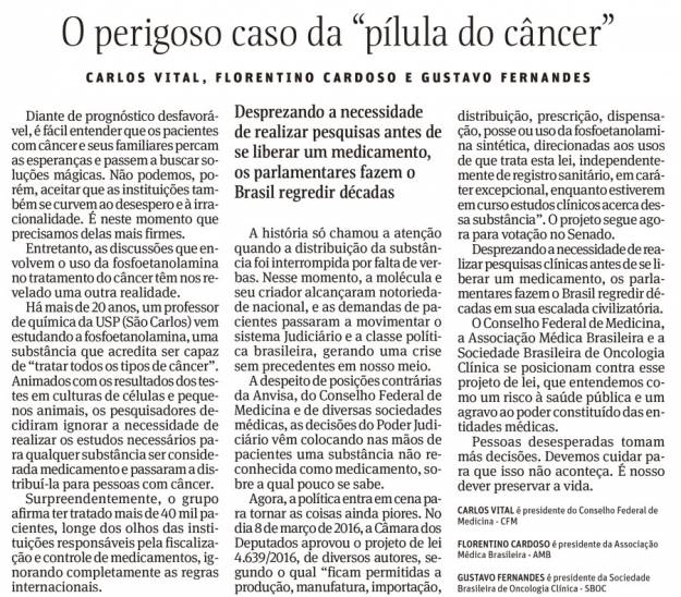 Este artigo foi assinado pelos Drs. Gustavo Fernandes (Presidente da Sociedade Brasileira de Oncologia Clínica), Carlos Vital (Presidente do Conselho Federal de Medicina) e Florentino Cardoso (Presidente da Associação Médica…